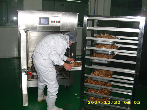 2、用強(qiáng)冷風(fēng)冷卻(冷卻隧道),時間可縮短,但中心溫度仍下降緩慢,自然冷卻的缺陷仍然存在,冷卻不均勻?qū)е率称吠饫鋬?nèi)熱,大大降低了食品的風(fēng)味。使用強(qiáng)冷風(fēng)冷卻的另一個很大缺陷就是能源消耗很大。真空冷卻的迅速降溫,阻止了食品因本身加工完畢后自身余熱的作用造成的過度熟化,過度熟化會讓食品失去本身的特殊香味。(例如,炒制的綠葉菜,如不經(jīng)過20分鐘內(nèi)迅速的降溫,那么它將會褐變,顏色不再鮮艷)